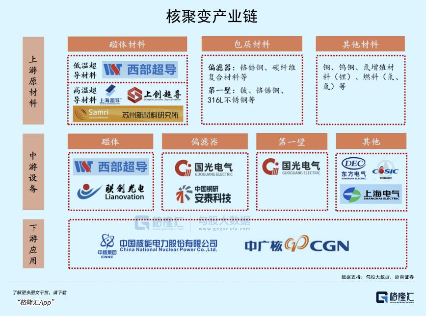 上游覆盖超导材料(Nb3Sn、ReBCO)、有色金属(钨、铜等)、特种钢材、特种气体(氘、氚)等原料供应。