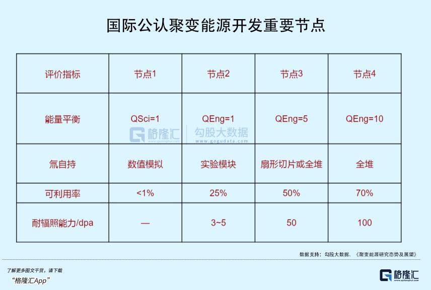 按照国际认可的聚变能源发展节点,用能量平衡、氚自持、可利用率、耐辐照能力4个指标来判断聚变堆商业化潜力。部分国家将2050年定为建成并投入运行能够发电的核聚变示范型反应堆(DEMO)的关键时间节点,也就是达到节点3的标准。