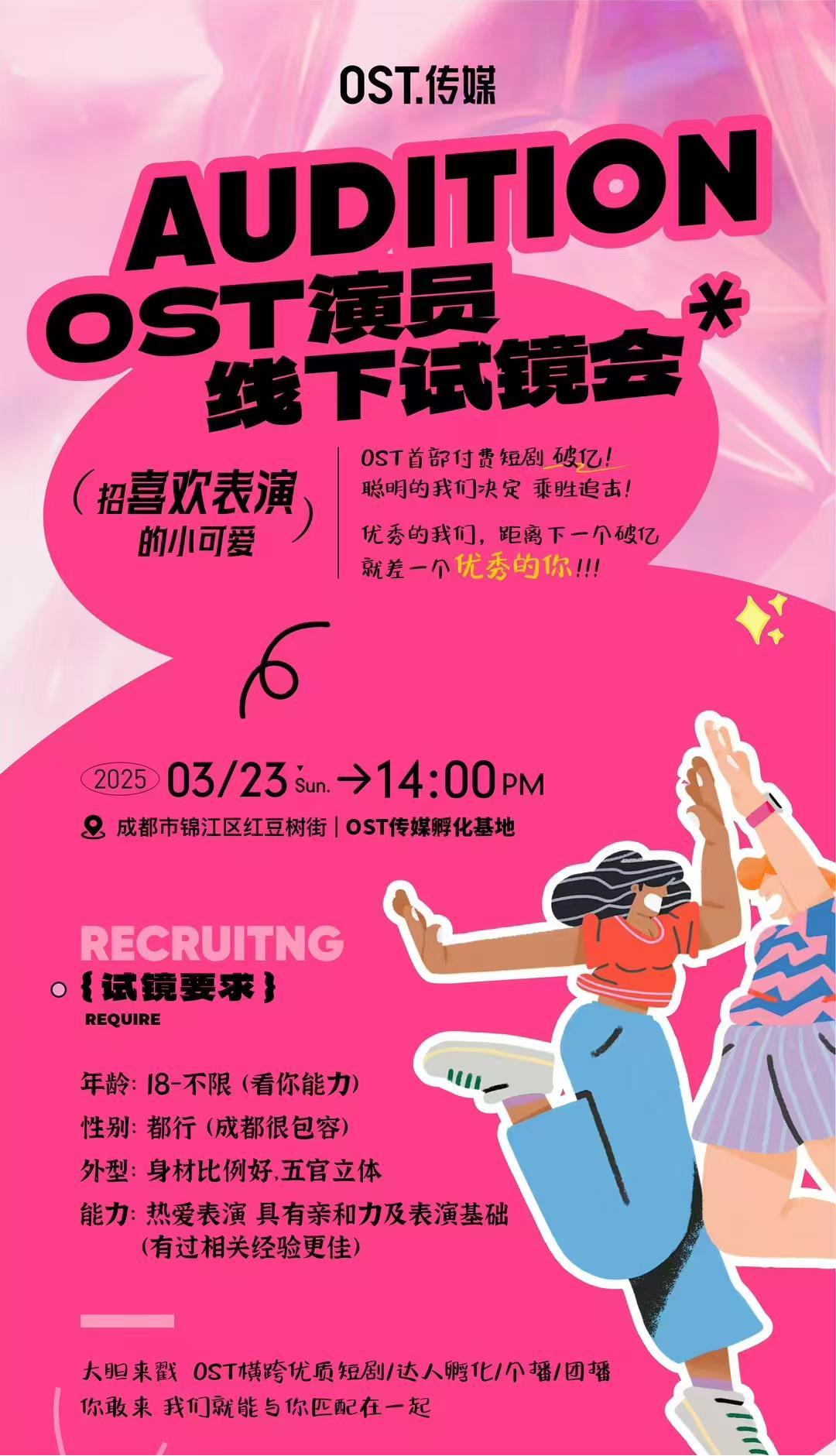 相比起纯签约成熟短剧演员,OST传媒的链条要更长一些,他们划分出单独的短剧演员经纪业务,从新人试戏选拔到演员培养再到出演公司项目,构建了从新人到成熟演员的上升全链条。