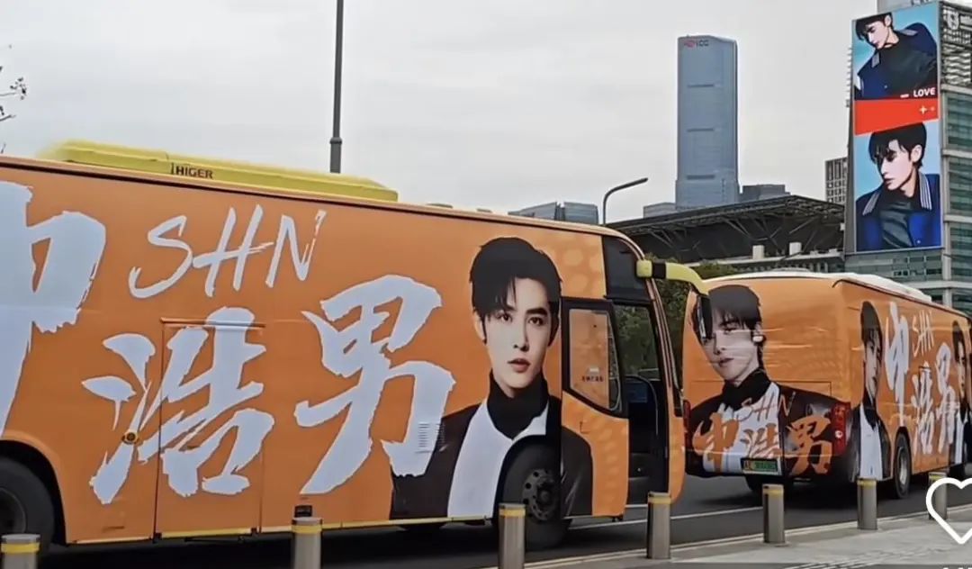 在“荧光之夜”的会场外,短剧演员的应援随处可见。公交站牌被演员王格格、张集骏的海报占据,申浩男的应援大巴环绕场馆,远处是切换着不同短剧演员饭制视频的大屏。