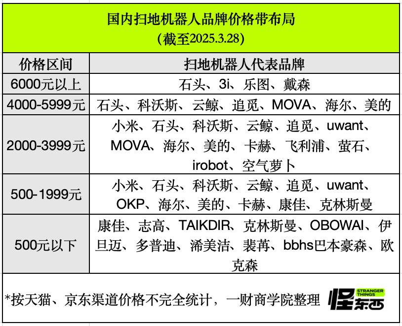我们统计整理了市面上各个价格区间带的扫地机器人代表品牌,发现扫地机器人品牌分布呈现“金字塔”: