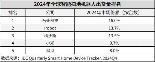 但话又说回来,中间价格带市场是最大的,增长空间也大,品牌不可能不竞争。2023到2024年,全球智能扫地机器人出货量年增长率达到11.2%。2024年出货量Top 5石头、iRobot、科沃斯、小米、追觅,产品几乎全部来自中间价格带。