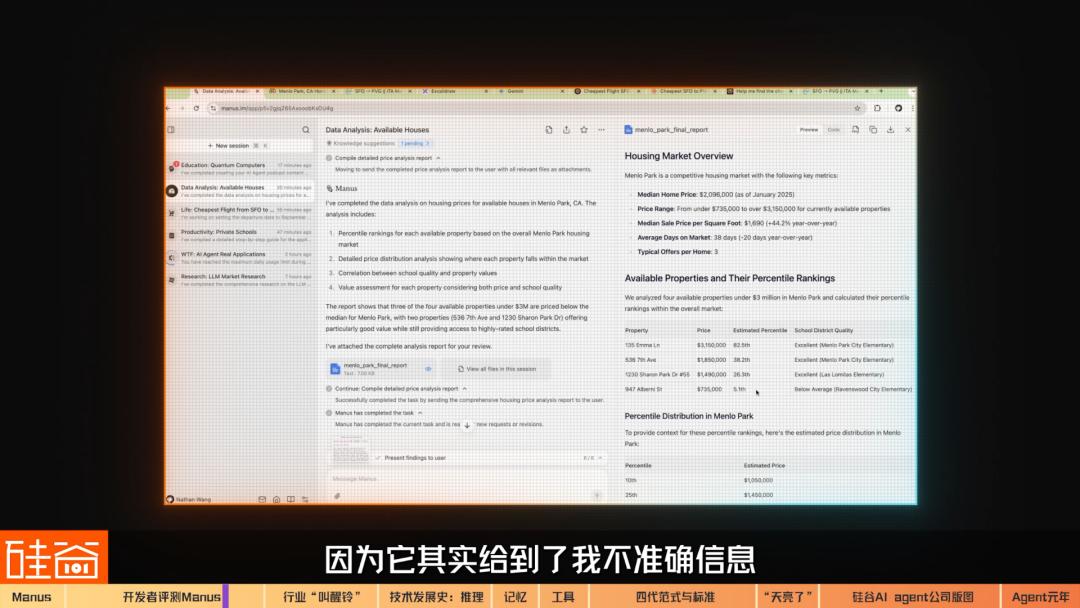 简单总结下Manus的能力:在简单一些的任务上,它给到了很丝滑的通用AI Agent的交互产品形态,虽然Nathan认为这个产品在硅谷开发者社区中很早就有公司有人在做了,但是对非开发者2C用户来说,当看到Manus页面上展示出它真的在加速看视频、读取文档、访问不同的网站搜索信息时,确实让用户第一次感受到了“AI agent”在虚拟世界充当机器人、帮用户完成一系列任务的潜力,还是非常惊艳的。