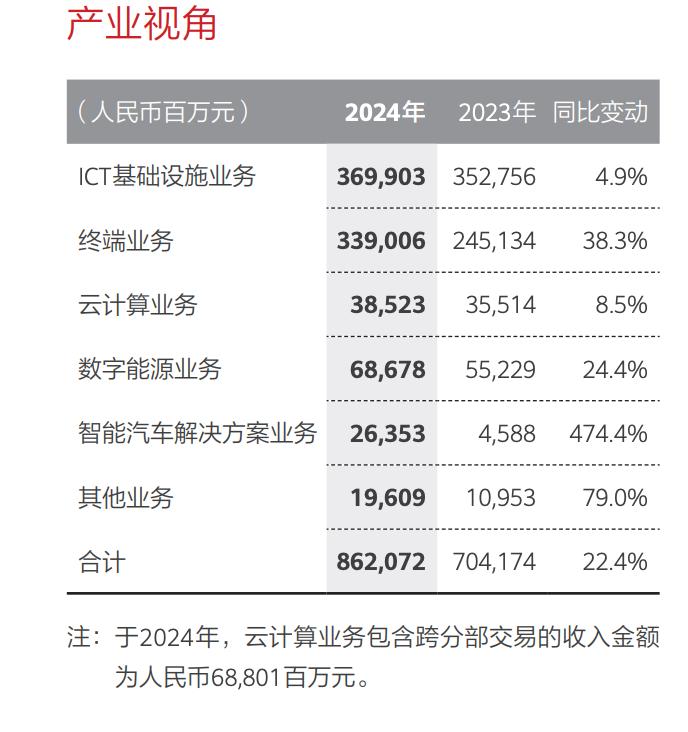 对于各个业务取得的成绩,华为在财报中表示,计算产业得益于提前十年的布局,抓住AI机会取得较大增长;终端重回增长快车道,鸿蒙生态正在取得历史性突破;华为云持续优化业务结构;数字能源坚持质量优先;智能汽车解决方案首次实现当年盈利。