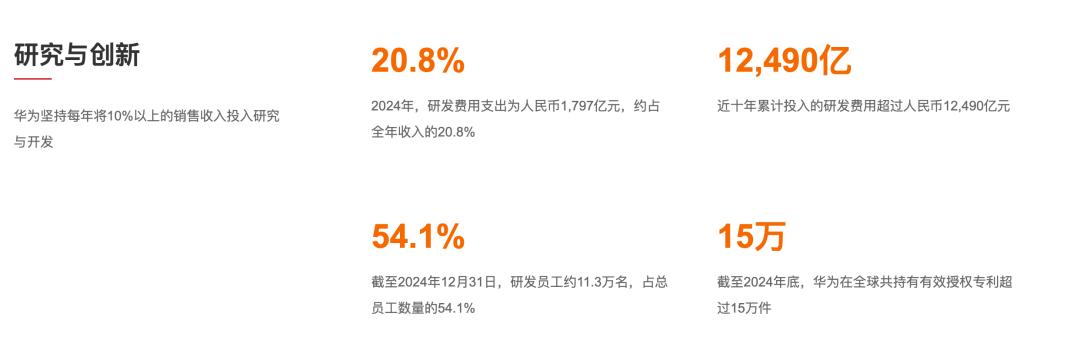 2024年公司研发费用支出达到1797亿元,约占全年收入的20.8%,近十年累计投入的研发费用超过12490亿元。