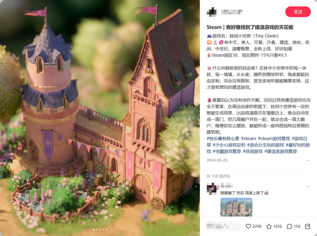 这一点似乎是厂商们喜闻乐见的现象:深度创作的玩家提供大量优质UGC内容的同时,提升了游戏粘性。而玩家们的“晒房帖”在社交平台上传播时,既能增强游戏的曝光度,又能吸引潜在玩家的好奇,无形中为游戏做了一次宣传。