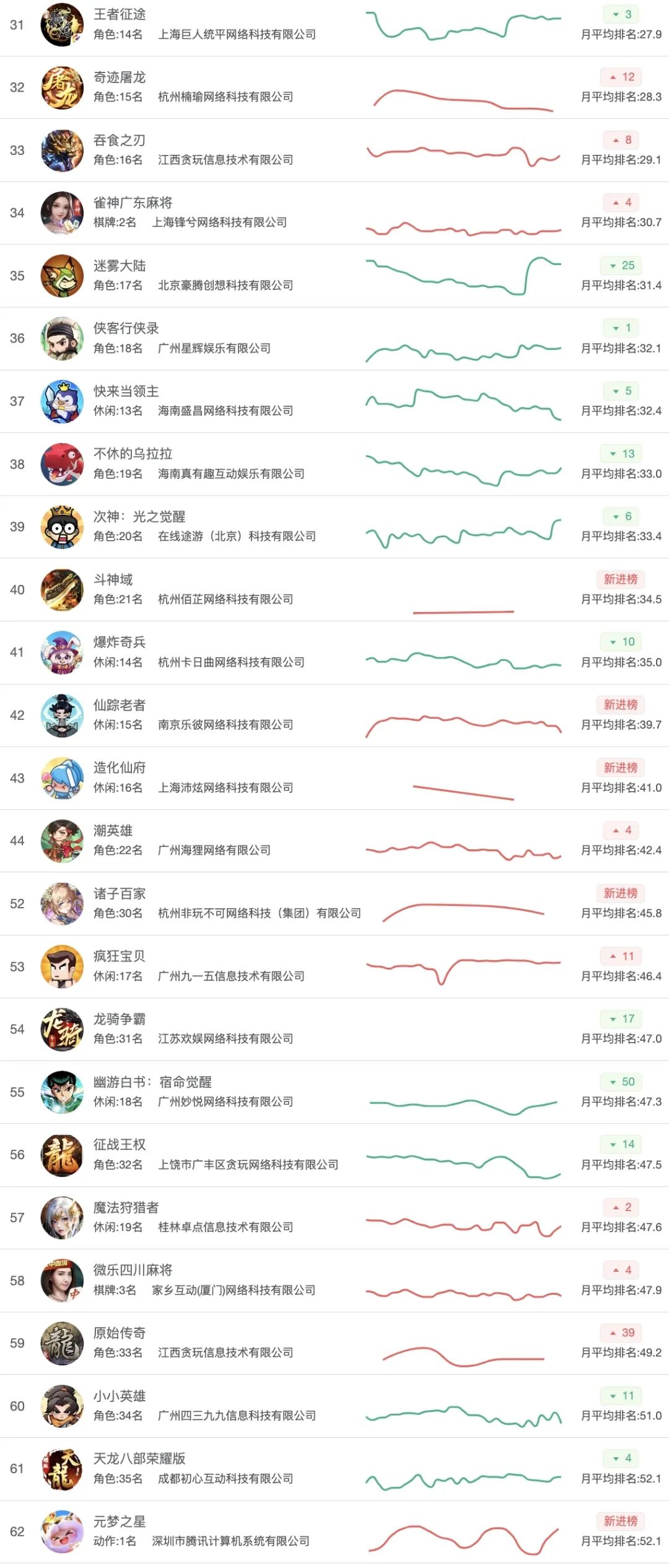 本期一批传统题材游戏表现突出,比如《荣耀世纪》站上第12名,《武侠大明星》提升8位,列26名;《原始传奇》《奇迹屠龙》《吞食之刃》《斗神域》等都有不错的名次——小游戏的下沉、复古、怀旧风还在继续。