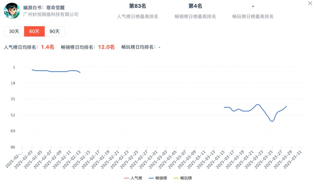 根据该游戏2025年3月排名平均值得出,变化为环比2025年2月月榜排名。