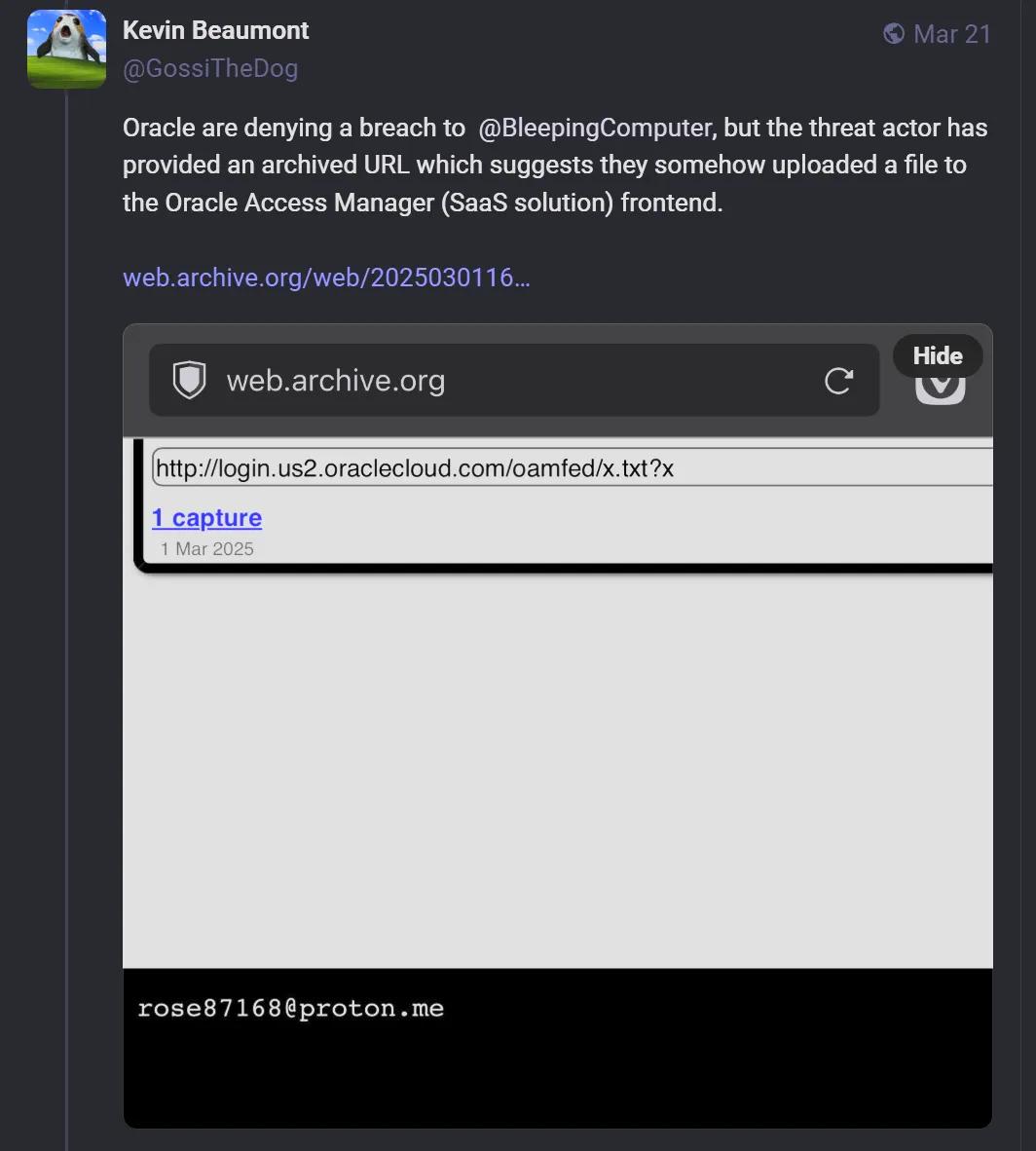 例如,黑客发布了一个 archive.org URL 并将其提供给媒体,暗示其确实拥有使用 Oracle 访问管理器的 login.us2.oraclecloud.com 服务的写入访问权限——要知道,该服务器完全由 Oracle 管理: