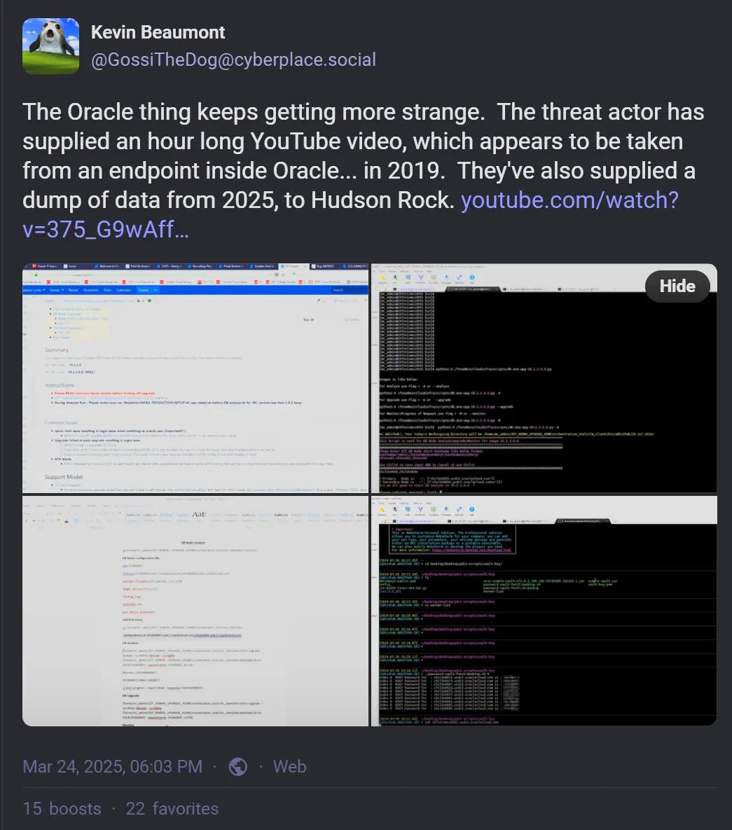 - Hudson Rock:黑客公布的数据确实来自 Oracle Cloud,且凭据真实有效。
