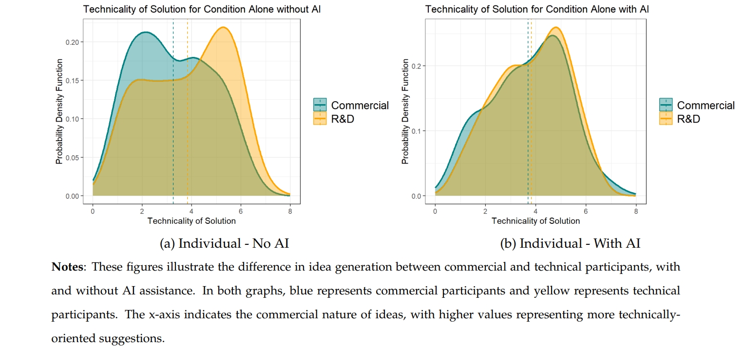 但AI在此领域再显威力。无论是团队还是个人,研发专家与商业专家在AI辅助下均能输出整合了技术-商业双重视角的平衡方案。如下图所示,AI条件下专家界限几乎消失,团队亦呈现出类似的效应。