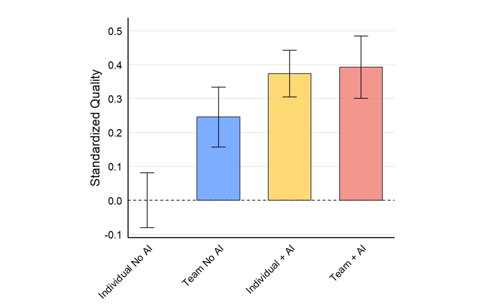 未使用AI时,团队表现显著优于个人(标准差为0.24,这个结果让强调团队价值的教师和管理者倍感欣慰)。但运用了AI的个体表现与未用AI的团队表现持平(较基线提升0.37标准差),这意味着AI能复现人类队友的效能——单人+AI即可达到过往双人协作的效果。