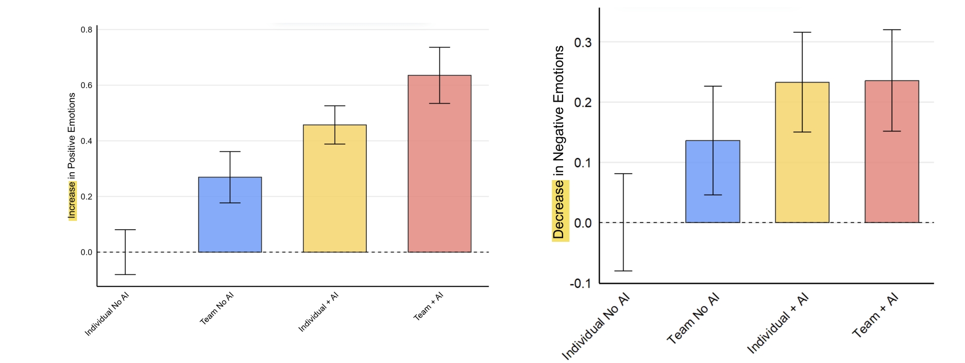 相较于无AI组(团队或个人),使用AI者的积极情绪上升、消极情绪下降。AI用户报告的兴奋感、活力和热情更高,焦虑与挫败感更低。使用AI的个体组的情绪体验与人类团队组相当甚至更优。