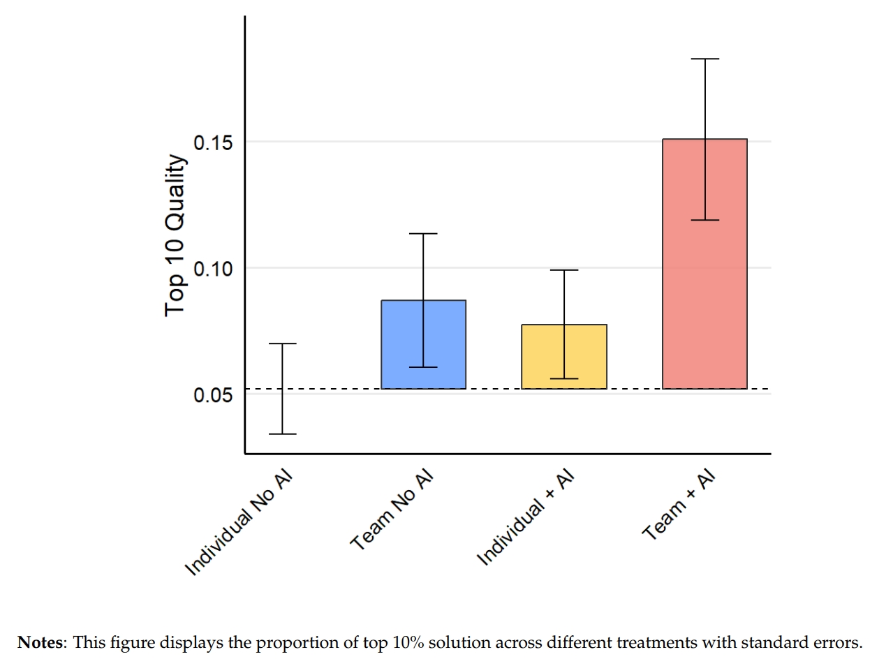 AI团队整体表现最佳(提升了0.39标准差),但与个体使用AI的表现差异无统计学意义。但在观察质量最好的前10%的顶尖方案时,AI团队输出此类方案的概率显著更高,表明人类团队协作的价值比个人光靠AI单打独斗的价值高。