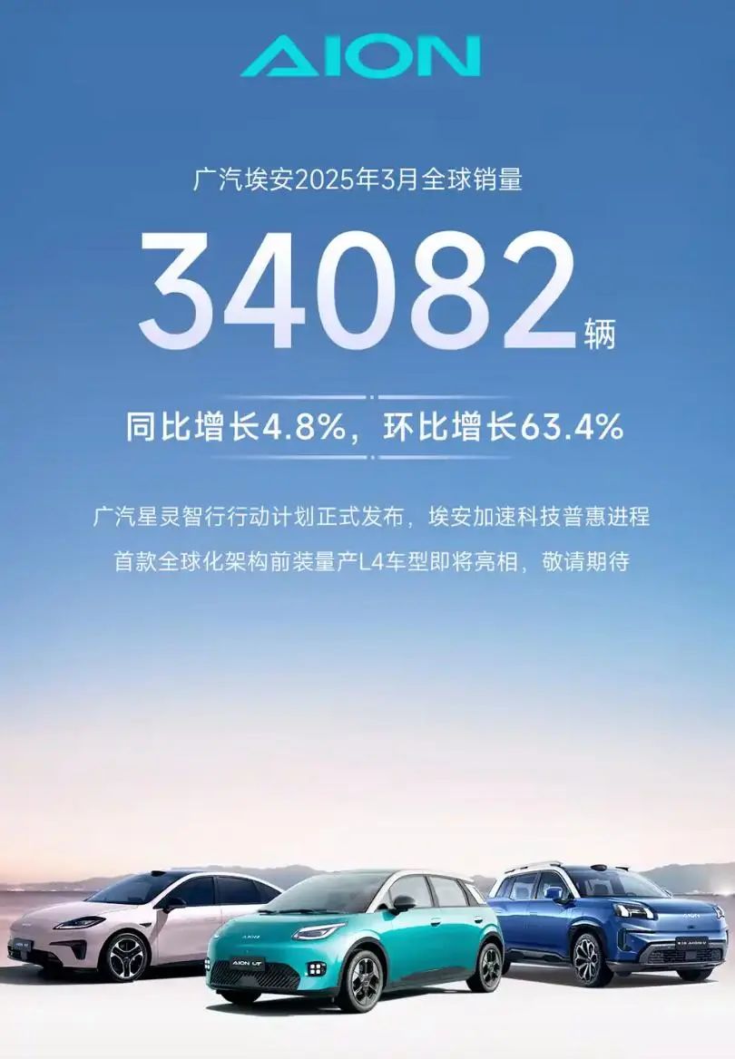 近日,埃安公布其3月份全球销量,为34082台,同比增长4.8%,环比增长63.4%。