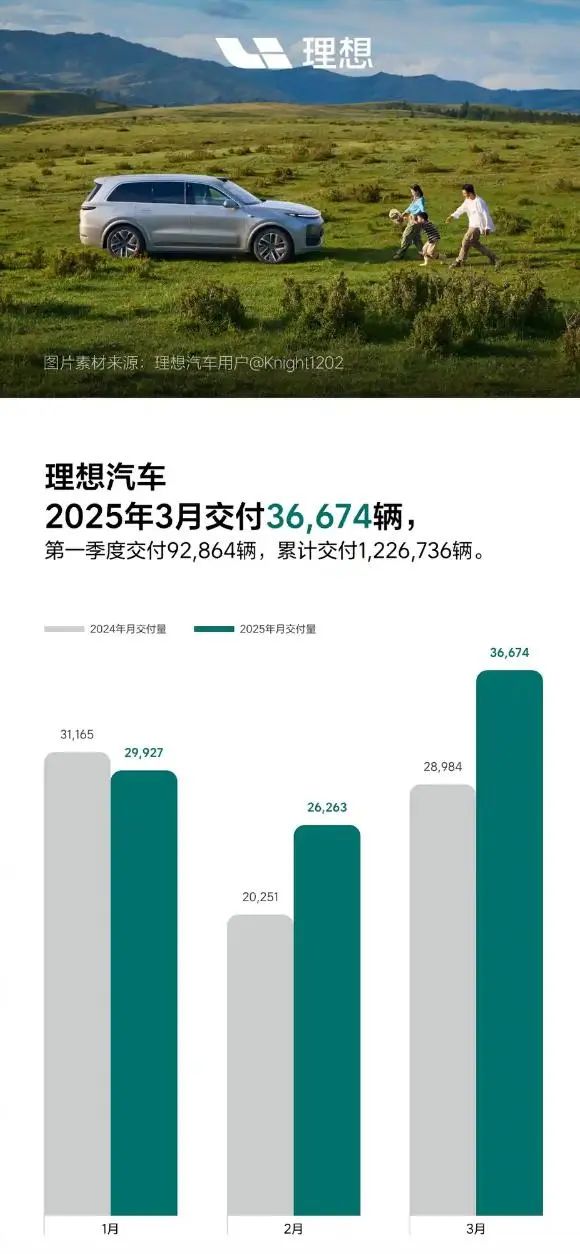 近日,理想汽车公布2025年3月交付数据。2025年3月,理想汽车交付新车36674辆,同比增长26.5%。2025年第一季度共计交付92864辆,同比增长15.5%。