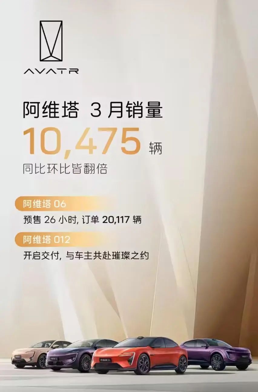 阿维塔宣布3月销量10475辆,同比与环比增长为100%。
