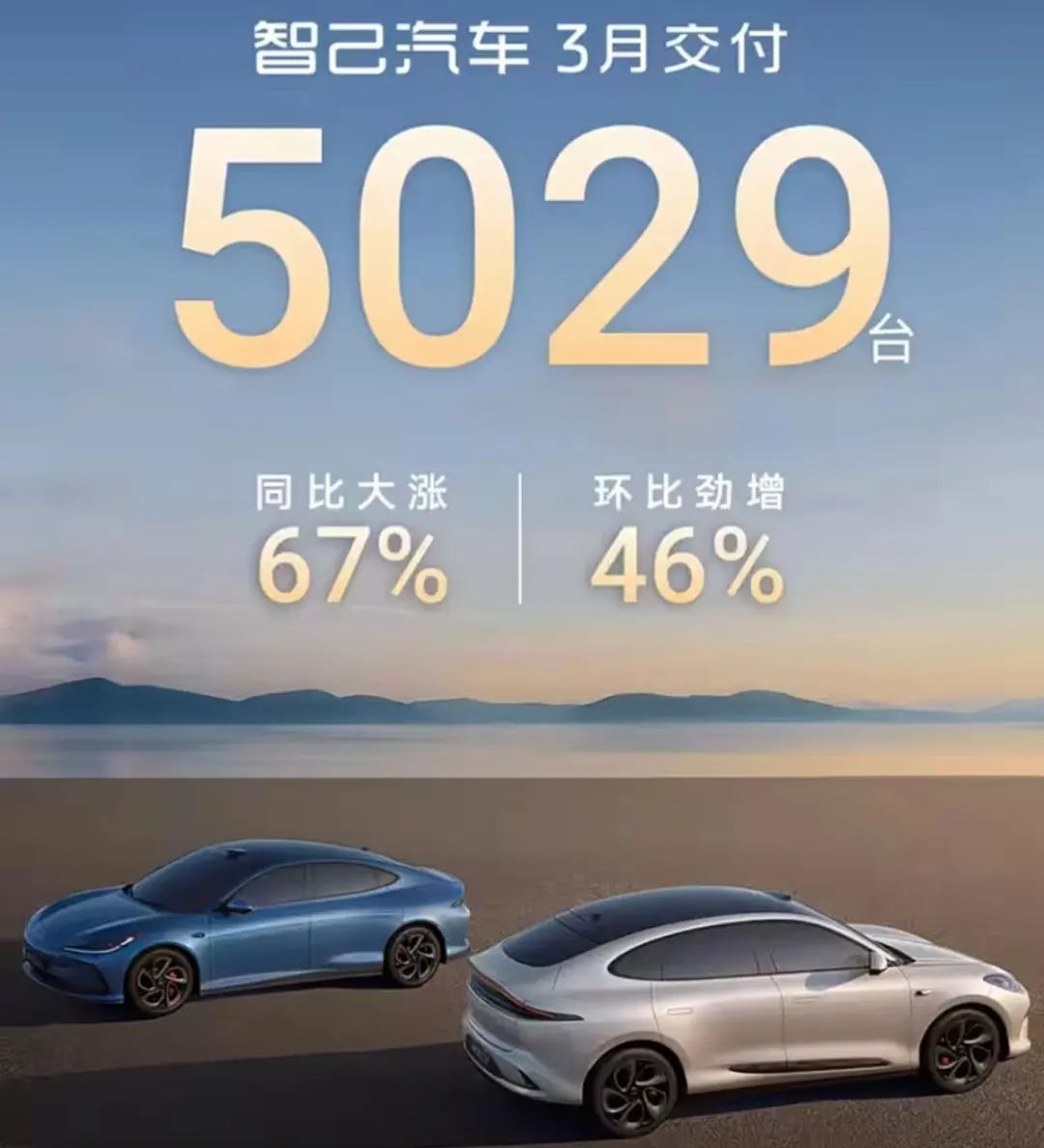 日前,智己汽车公布3月销量数据,共计交付新车5029台,同比增长67%,环比增长46%。
