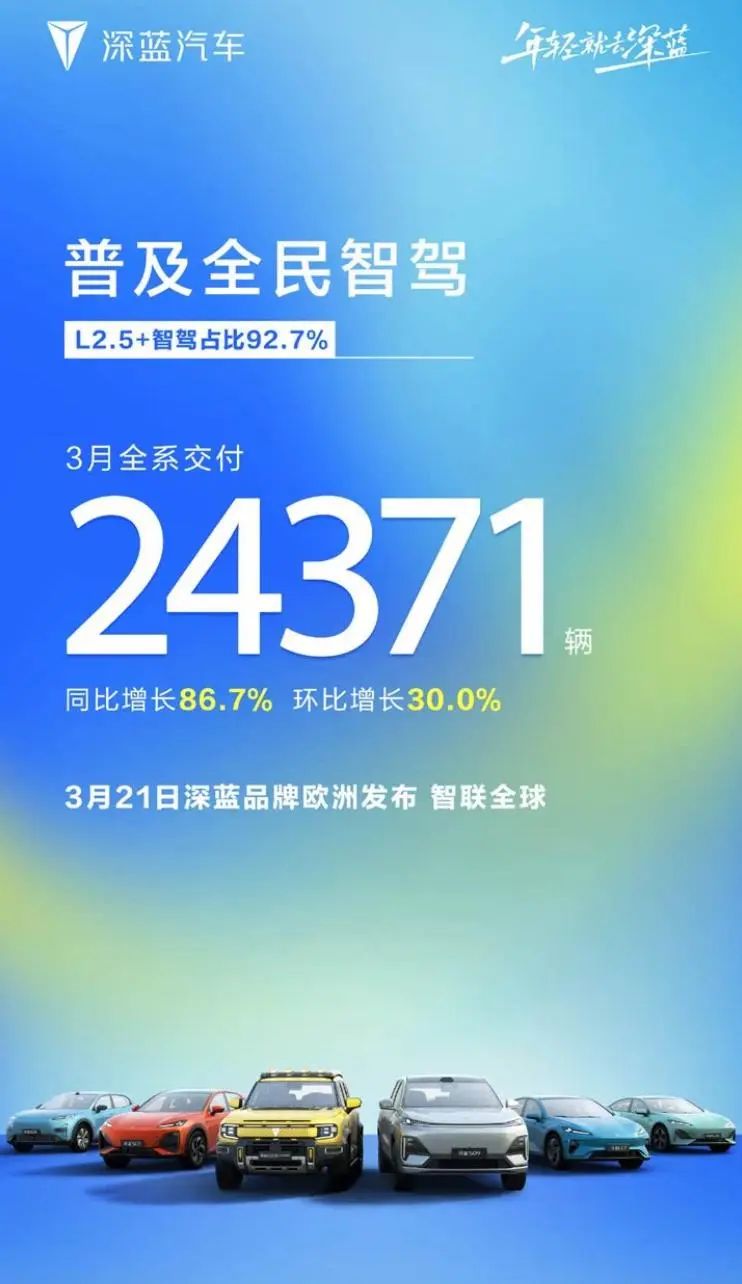 深蓝汽车2025年3月交付24371辆,同比增长86.7%,环比增长30.0%。