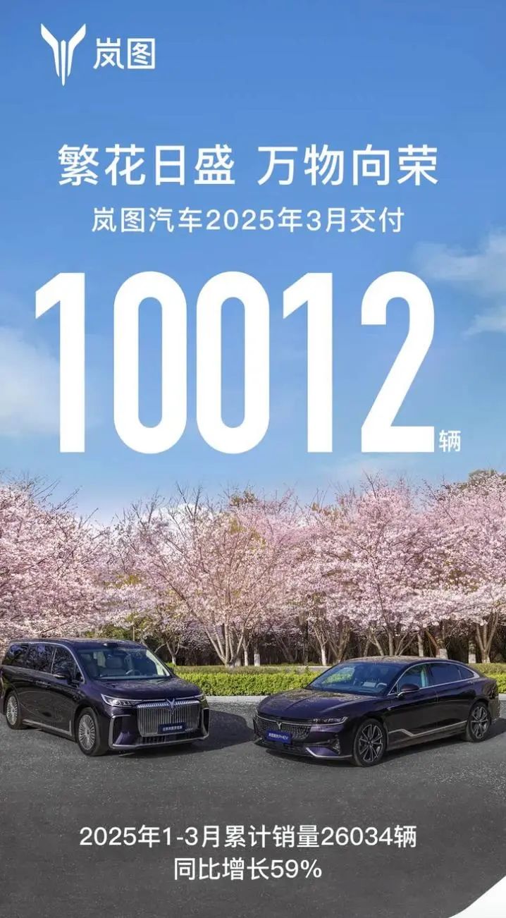 岚图汽车2025年3月交付10012辆,同比增长64%,2025年1-3月岚图汽车累计销量26034辆,同比增长59%。