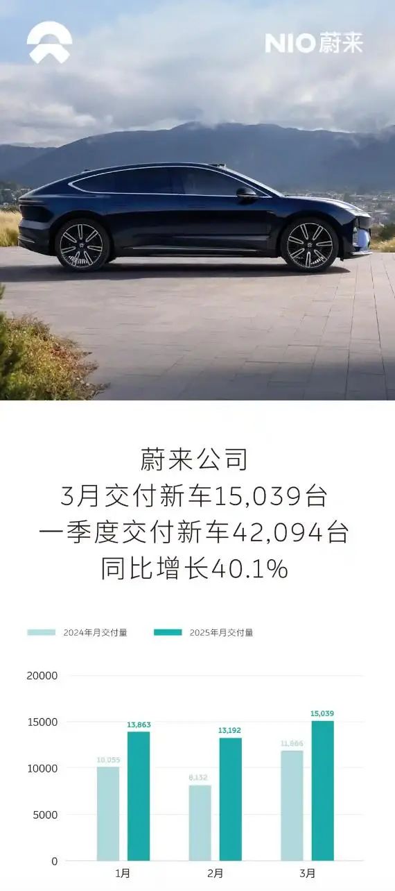 3月份蔚来公司交付新车15,039台,同比增长26.7%。其中,蔚来品牌交付新车10,219台;乐道品牌交付新车4,820台。2025年一季度,蔚来公司共交付新车42,094台,同比增长40.1%。