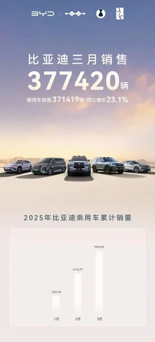日前,比亚迪公布了2025年3月销量为377420辆,乘用车销量371419辆,同比增长23.1%。2025年比亚迪乘用车累计销量达到986098辆。比亚迪新能源车累计销量超1160万辆。
