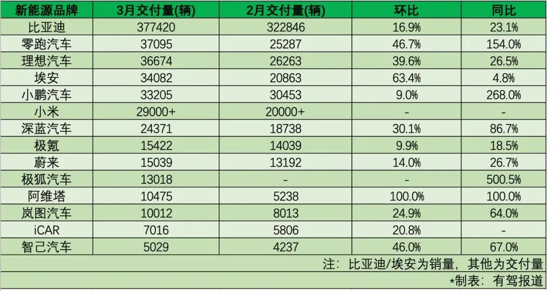 近日,各新能源车企纷纷公布了3月交付量,其中比亚迪、理想继续保持稳定,走出自己的节奏;而小鹏汽车、零跑汽车成为最大亮点,重新改写市场格局,单月销量均站上3万台水平;蔚来、极氪则在1.5万台附近徘徊,那么其他品牌表现如何,我们接着往下看。