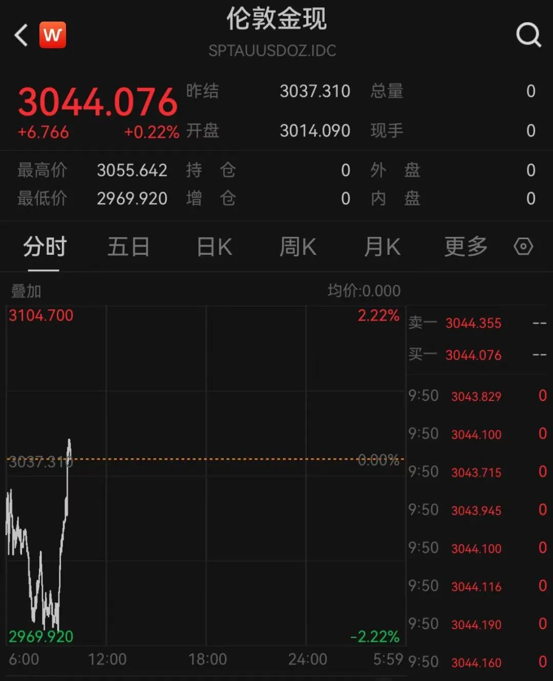 不过随后,二者均日内转涨。截止发稿,现货黄金报3044.076美元/盎司,COMEX黄金报3074.5美元/盎司,涨1.27%。