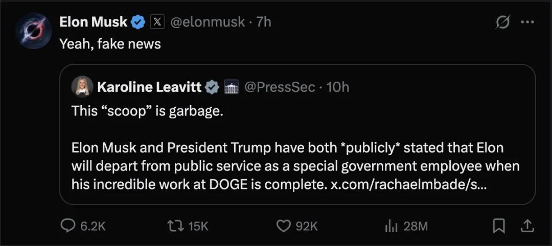 然而,耐人寻味的一幕随后出现了,白宫却跑出来“证实”——马斯克即将离职。