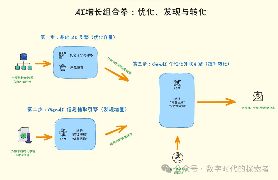 基础AI引擎优化了“存量”,但要实现爆发式增长,必须开拓“增量”。案例的关键转折点在于第二步:“使用GenAI从非结构化的公共数据(如建筑许可)中提取洞察,识别新机会。”