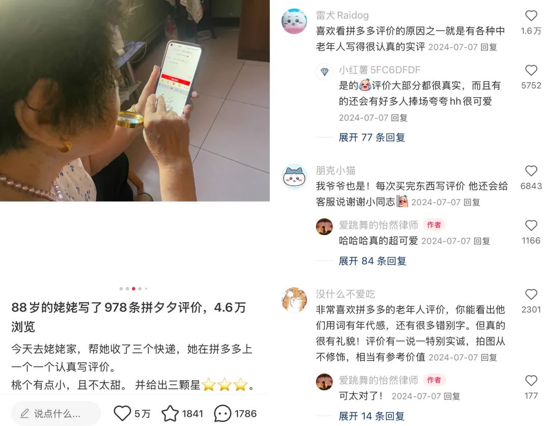 2024年一位博主发现,自己88岁的姥姥在拼多多写了978条评价,有4.6万浏览量。姥姥给每个包裹认真写评语:桃子有点小,不太甜,给三星;衣服已收到,穿着非常合适。