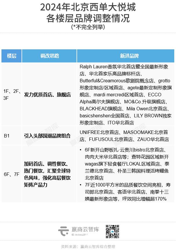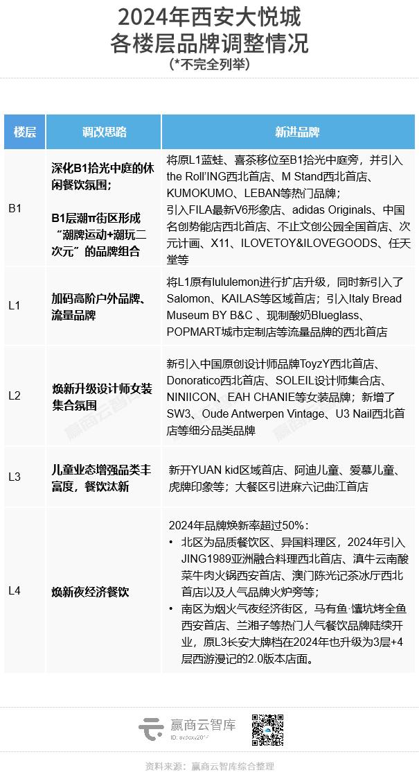 成都大悦城2024年品牌调改率20%,先后调改场内品牌130余家,包括新开业品牌35家、品牌形象升级18家,引入首店品牌17家。