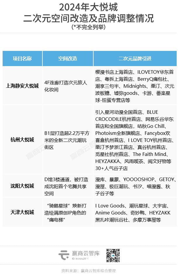 《2024大悦城二次元年度报告》显示,2024年大悦城二次元业态总销售额突破11.1亿元,全国大悦城二次元门店总数已达311个。当中,不少为2024年新引进品牌,此外,部分大悦城项目也针对二次元标签,进行特色空间改造。