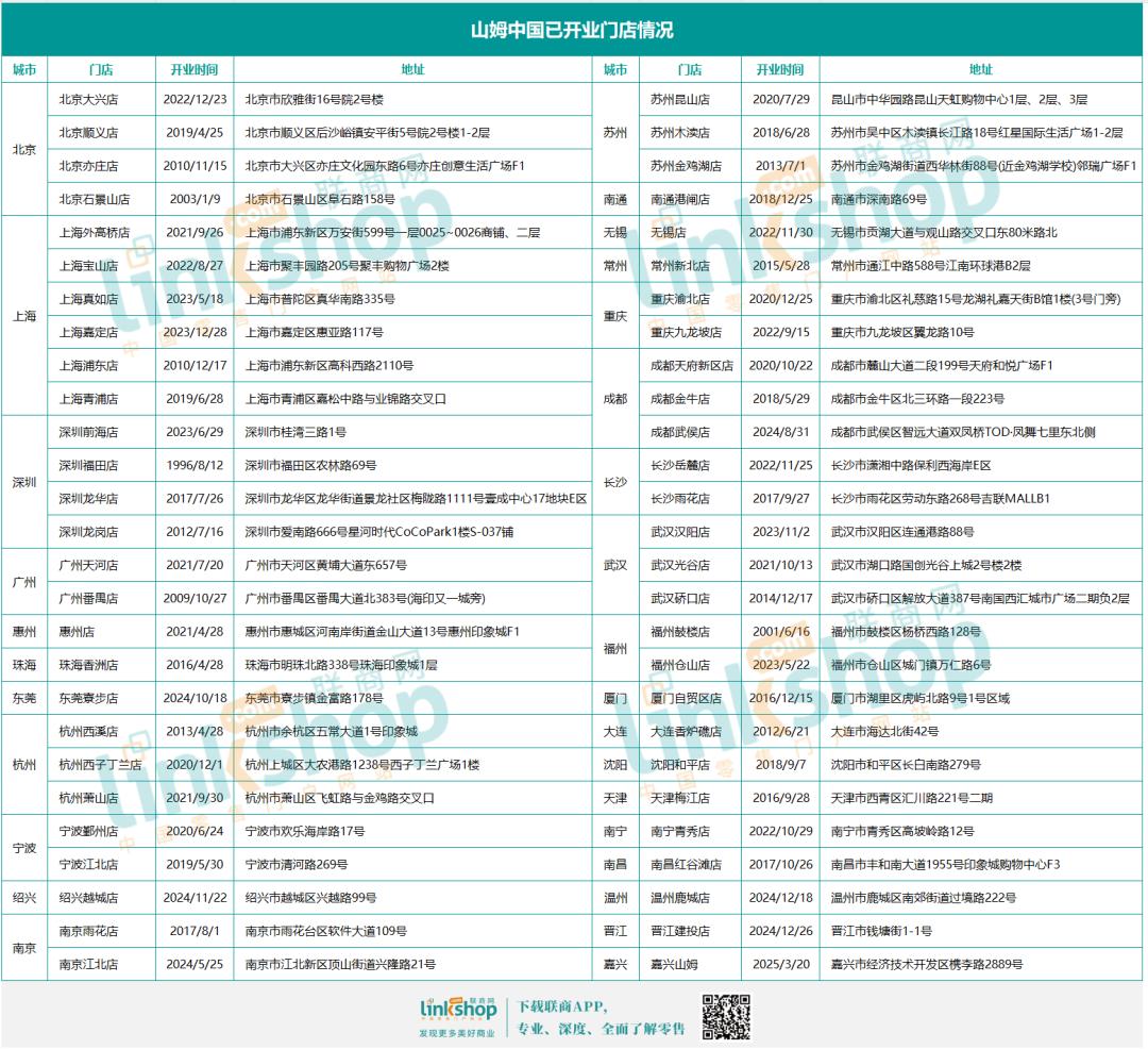 2015年后,随着中国消费升级趋势显现,山姆加快扩张,尤其2020年后保持每年5-6家的开店速度。2024年开出6家新店,包括首次进入泉州、晋江等县级市场。2025年将是山姆在华开店最密集的一年,计划新开7家门店,覆盖嘉兴、合肥等多座城市,其中张家港将成为第三个“县级店”。