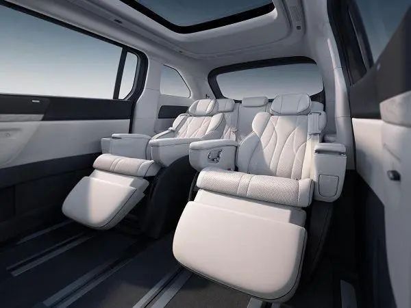 新车外观延续现款设计语言,分体式头灯与贯穿式灯带组合保持辨识度,新增紫、蓝、灰三款车漆及20英寸悬浮轮毂盖设计。新车尺寸保持不变,座舱整体设计保留现有布局,内饰主要改进座椅功能:前两排标配通风/加热/按摩,副驾女王座椅新增零重力自动调节模块,第三排加入加热功能。新增过道版车型配备14向电动调节零重力座椅,无过道版本标配16向调节并搭载香氛系统。