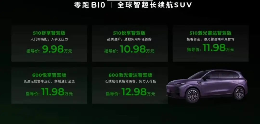 4月10日,零跑汽车B平台首款车型B10正式上市,新车定位紧凑型纯电SUV,价格区间为9.98万-12.98万元,其中11.98万元的激光雷达智驾版就配备了激光雷达。新车基于LEAP 3.5技术架构开发,搭载高通骁龙8295座舱芯片与8650智驾芯片组合。此外,零跑与Stellantis集团玛莎拉蒂团队联合进行了零跑B10的底盘调校工作,进一步提升新车的驾驶质感。