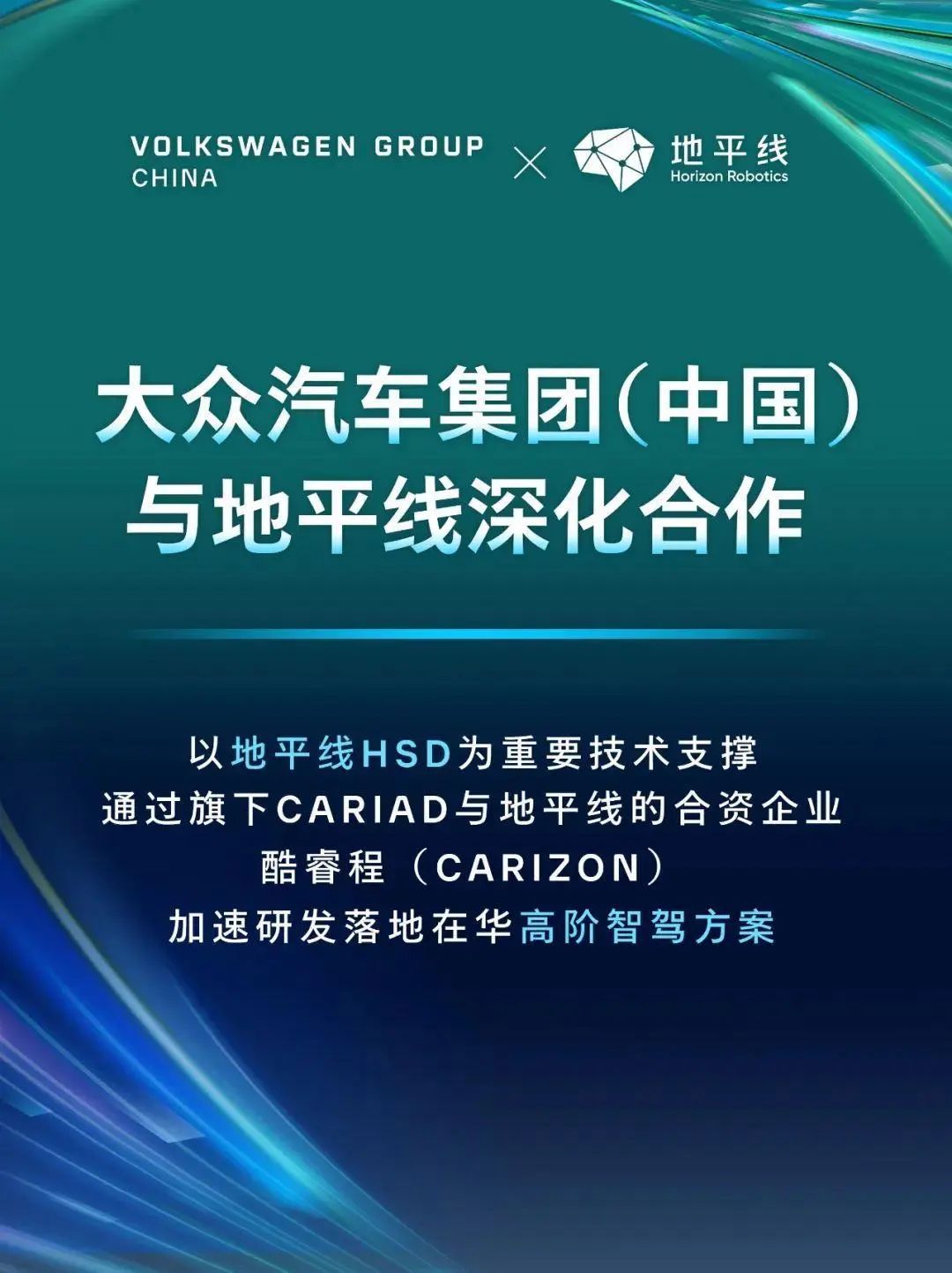 4月7日,大众汽车集团与地平线正式宣布,在高阶领域基于地平线全场景智能驾驶方案HSD展开进一步合作。HSD将作为大众汽车集团“在中国、为中国”战略下智能驾驶研发的重要技术支撑,通过CARIAD与地平线的合资公司酷睿程(CARIZON)加速研发,并预计2026年落地在大众汽车集团旗下新车型上。