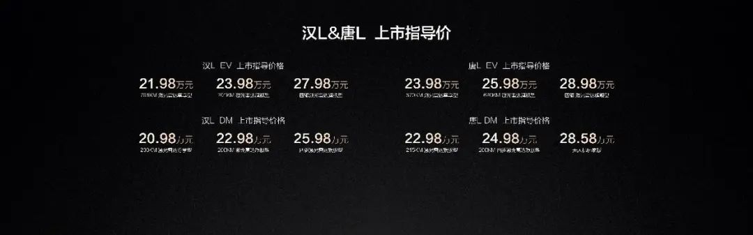 比亚迪在4月9日同步推出王朝网全新旗舰车型——中大型轿车汉L与中大型SUV唐L,双车均提供DM插混与EV纯电版本,起售价分别为20.98万元和22.98万元。两款车均提供纯电和插电混动两种动力类型,纯电车型基于超级e 平台打造,具备1000V高充电电压、兆瓦闪充电池,可实现5分钟充电400km。插混车型应用第五代混动技术。