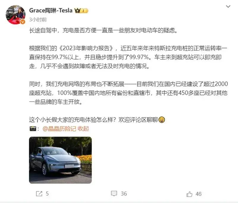 同时她表示,根据特斯拉的《2023 年影响力报告》,近五年来特斯拉充电桩的正常运转率一直保持在 99.7% 以上,并且稳步提升到了 99.97%。车主来到超充站可以即充即走,几乎不会遇到故障或者无法及时充电的情况。