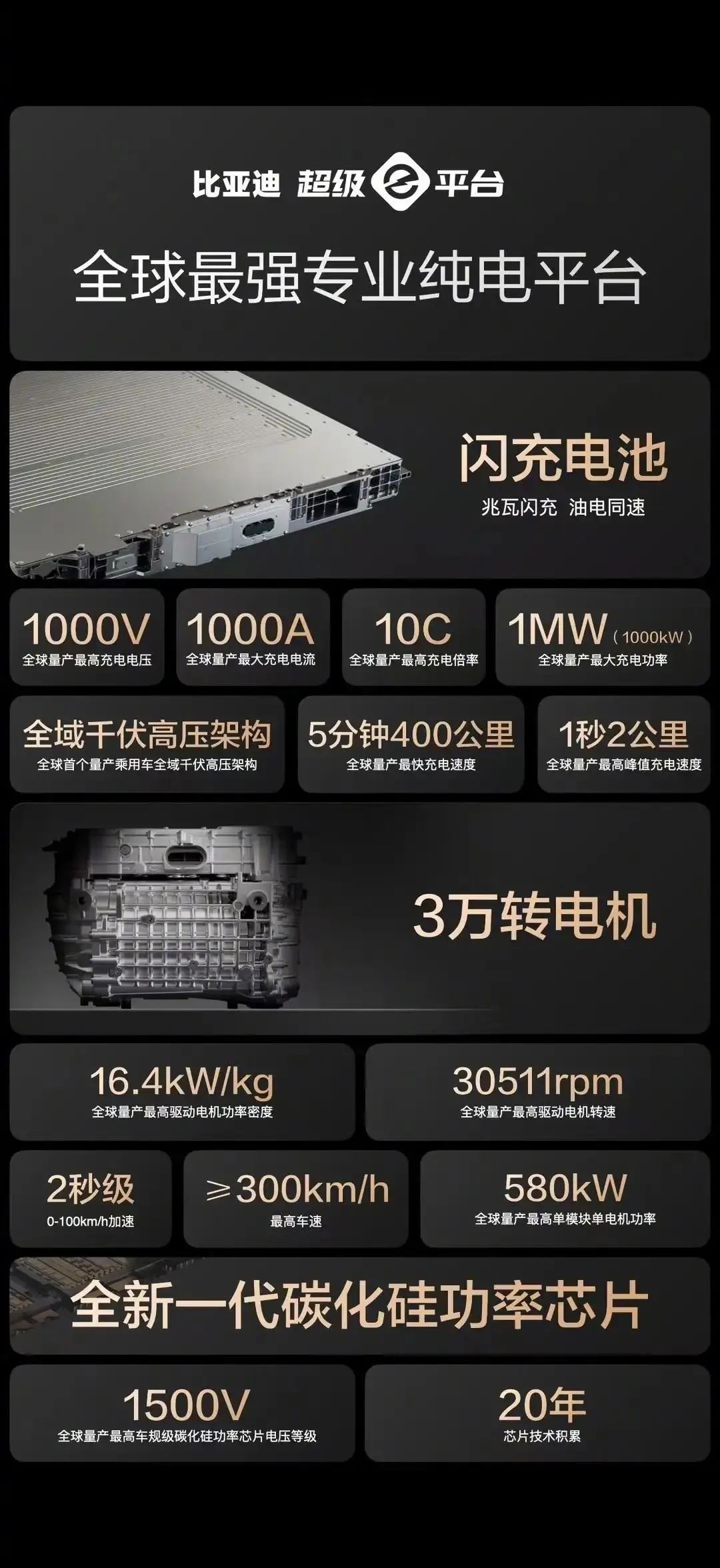 4月9日,以超级e平台打造的比亚迪汉L 唐L正式上市,此次活动中,进一步介绍了公司超级e平台技术的诸多亮点,包括闪充电池、3万转电机和新一代车规级碳化硅功率芯片。这些技术的推出使得充电速度达到全球量产最快,闪充5分钟可行驶400公里,同时单模块单电机功率达到580kW,最高车速超过300km/h。