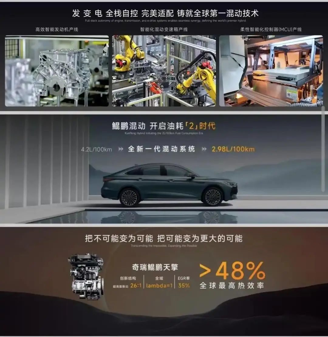 奇瑞混动技术的核心竞争力源自其全栈自研的“鲲鹏混动全域架构”,涵盖发动机、变速箱、电机、电控四大核心模块,通过智能化与场景化设计,实现性能、效率与安全的全面跃升。