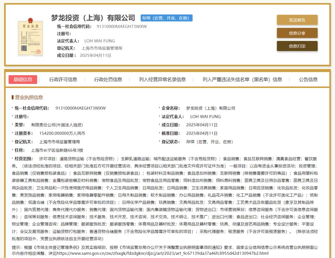 工商资料显示,4月11日,梦龙投资(上海)有限公司成立,注册资本15.42亿人民币,经营范围含道路货物运输、生鲜乳道路运输、城市配送运输服务、食品销售、食品互联网销售、清真食品经营、餐饮服务、以自有资金从事投资活动等。该 新实体的注册地址是 上海市长宁区临新路66号3楼。