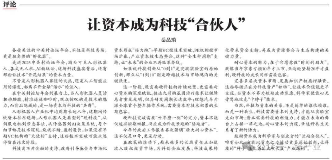 不过,巧合的是,就在朱啸虎批量退出人形机器人公司登上热搜时,国内科技领域顶会中关村论坛在会刊上刊发了一篇封面文章,文章主题是《让资本成为科技的“合伙人”》。