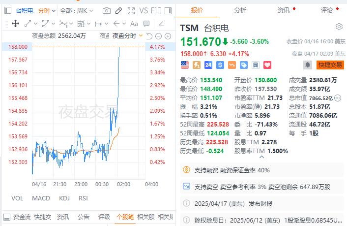 业绩公布后,台积电美股夜盘涨超4%。