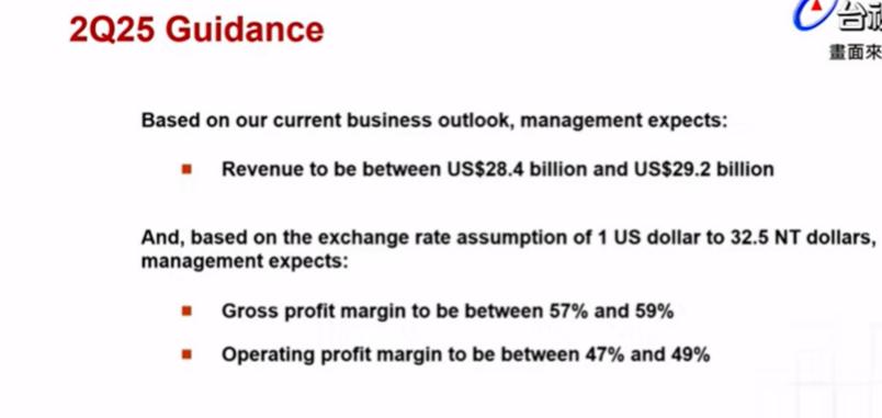 台积电第一季度营收8392.5亿元台币,同比增长42%,增长部分由于关税政策之前的囤货行为。公司预计,第二季度销售额284亿美元至292亿美元,第二季度营业利润率达47%至49%,毛利率将达到57%至59%。