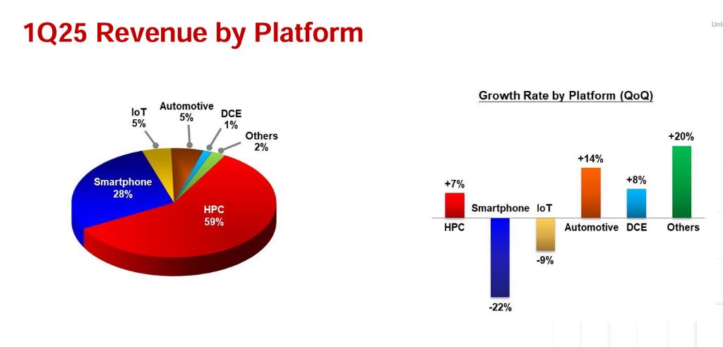 从收入分布来看,HPC(高性能计算):占比最大,达到59%。Smartphone(智能手机)占比28%,是第二大收入来源。IoT(物联网) 和 Automotive(汽车)各占5%。DCE(其他消费电子)占比1%。Others(其他)占比2%。