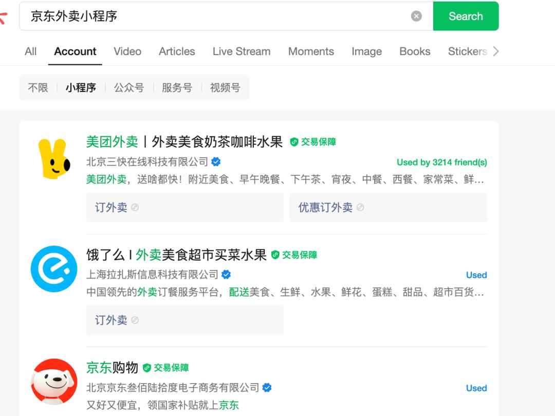 如果是前者,独立业务京东外卖。那么一定会需要孵化出一个独立的京东外卖APP,现在因为京东外卖没有独立的APP,也就导致了没有独立的账户体系,在微信上搜索京东外卖只有服务号但是没有小程序。