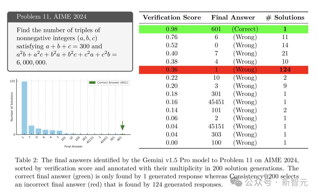Consistency返回错误答案1,且该答案在超一半的响应中出现,而Verification成功从响应分布长尾中识别出正确答案601,并对1和601分别给出了≤36%和98%的分数。