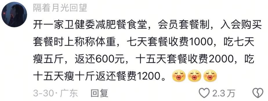 有人提出一个完美的创业计划:开一个卫健委食谱食堂,入会购买套餐时称体重,减重了还能返还现金。