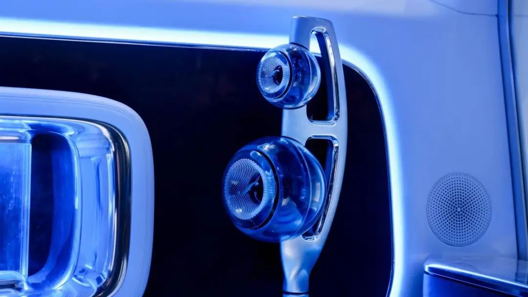 更显奢华的是奔驰 VISION V 概念车的扬声器配置:一共 42 个柏林之声扬声器组成了支持杜比全景声的环绕音响系统,其中有个 4 个扬声器被玻璃罩包裹,安装在了车身延伸出来的立柱之上,这个设计足够有辨识度,算是突出了音响系统的存在感。